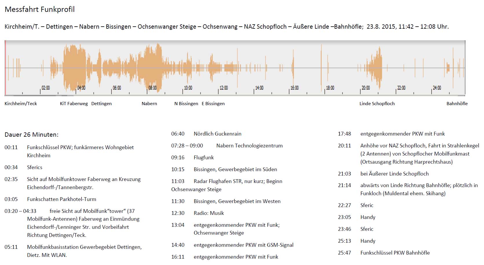 Funk hörbar Eine Mess-Fahrt im Pkw von Kirchheim über Dettingen, Nabern, vorbei an Bissingen, Ochsenwang, ... Hier klicken, um die Audiodatei abzuspielen. Bitte auf die Lautstärke achten. Es geht leise los. Die runtergeladene Datei zeigt beim Abspielen im Win Media Player ev. eine Visualisierung ![]() zur EMF-Startseite zu weiteren Fallstudien zur Hauptseite