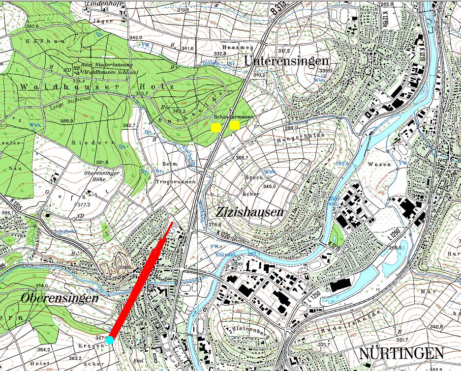 Schinderwasen Zwischen Unterensingen und Zizishausen bei Nürtingen liegt am Ostrand der Anhöhe Buchhalde die Flur Schinderwasen. Der autobahnartige Ausbau der B313 durchschneidet das Waldgebiet, und könnte daher für vorhandene Baumschäden verantwortlich gemacht werden. Besonders Rotbuchen reagieren auf plötzliche Freistellung empfindlich. Tatsächlich ist auch die HF-Eposition in Betracht zu ziehen. Von einerm Masten auf dem Galgenberg oberhalb Oberensingen verlaufen mehrere Hauptstrahlrichtungen auf den Schinderwasen zu. Die Entfernung beträgt ca. 2,4 km. ![]() (Kartengrundlage: LGL) Stand: Januar 2015 zur EMF-Startseite zu weiteren Fallstudien zur Hauptseite