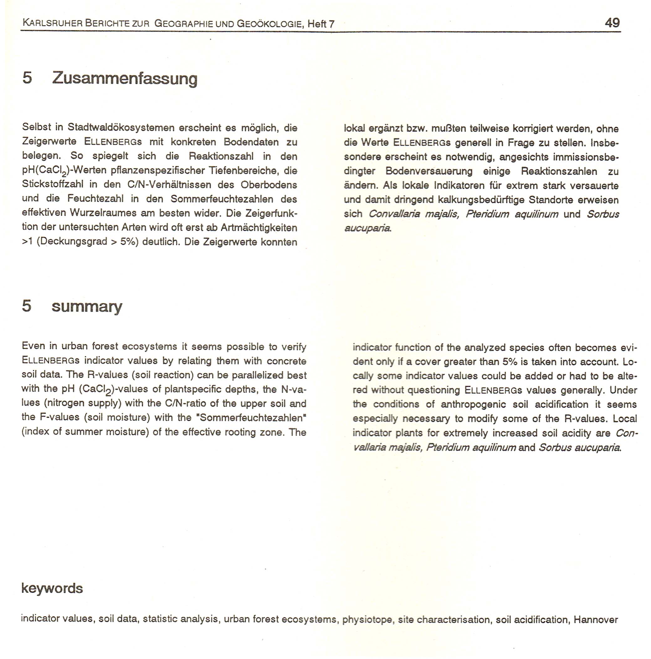 - (1995): Zur pedoökologischen Indikatorfunktion der Vegetation des Stadtwaldes von Hannover. Untersuchungen zur Parallelisierung von Zeigerwerten nach Ellenberg mit Bodendaten im Hinblick auf eine Physiotopdifferenzierung. - Karlsruher Berichte zur Geographie u. Geoökologie 7: I-II + 1-53 (45 Abb., 21 Tab.) + 1 Korrekturbeilage (hier als pdf-Datei); Karlsruhe. Zusammenfassung/Summary