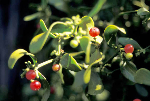 Viscum cruciatum Im Gegensatz zu den übrigen europäischen Mistel-Sippen mit weißen Beeren hat die Ölbaum-Mistel rote Beeren. In Griechenland kommt sie aber nicht vor. Die Aufnahme stammt aus dem Botanischen Garten Hohenheim.
